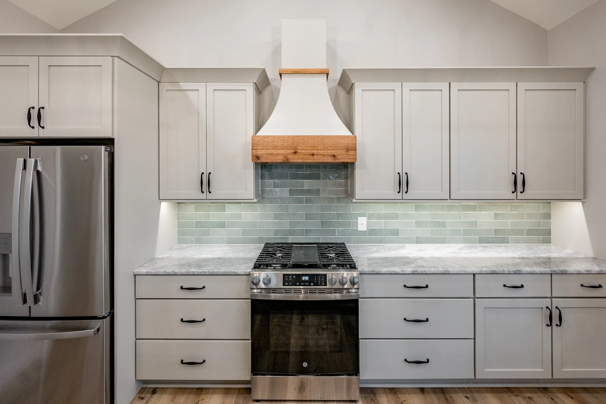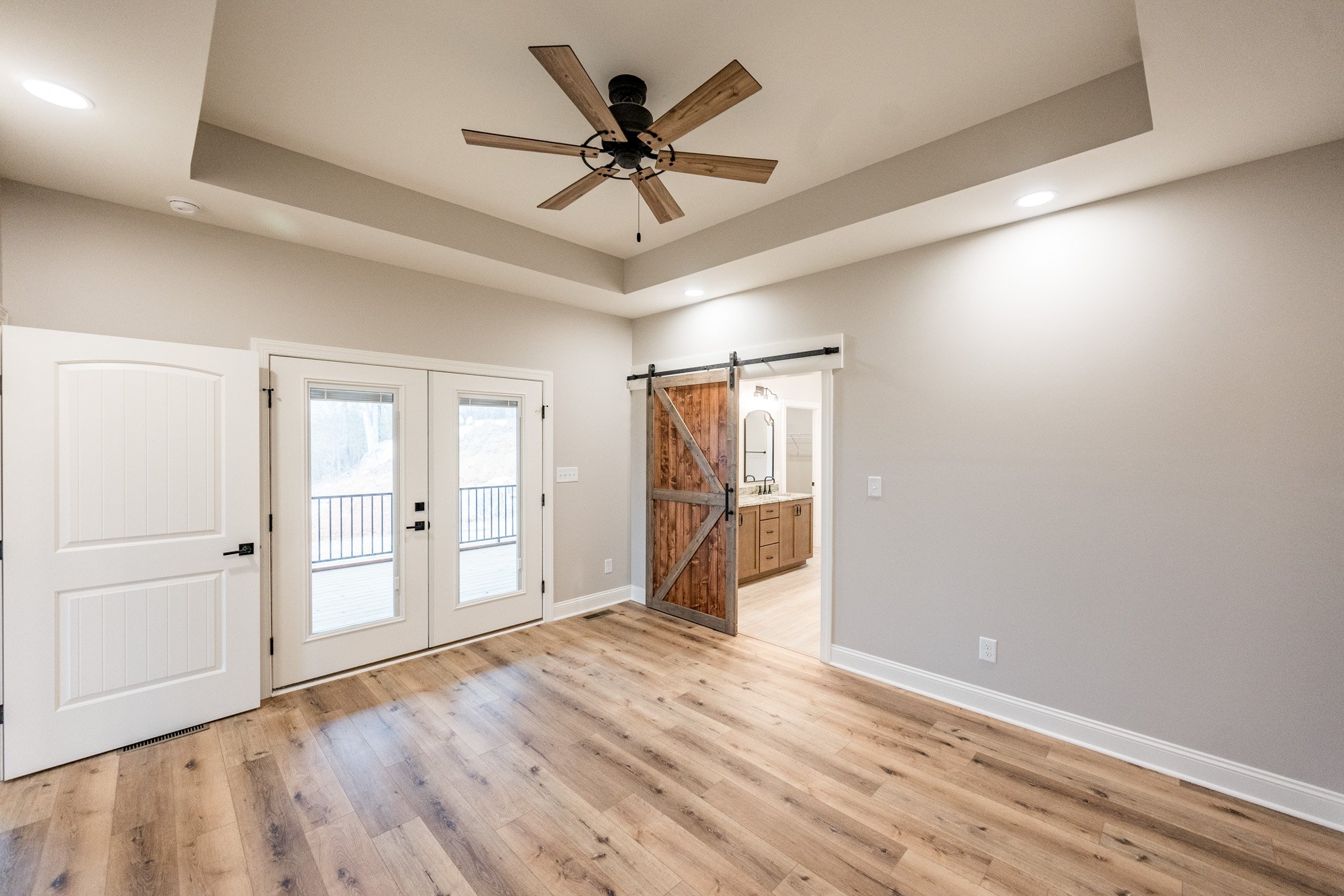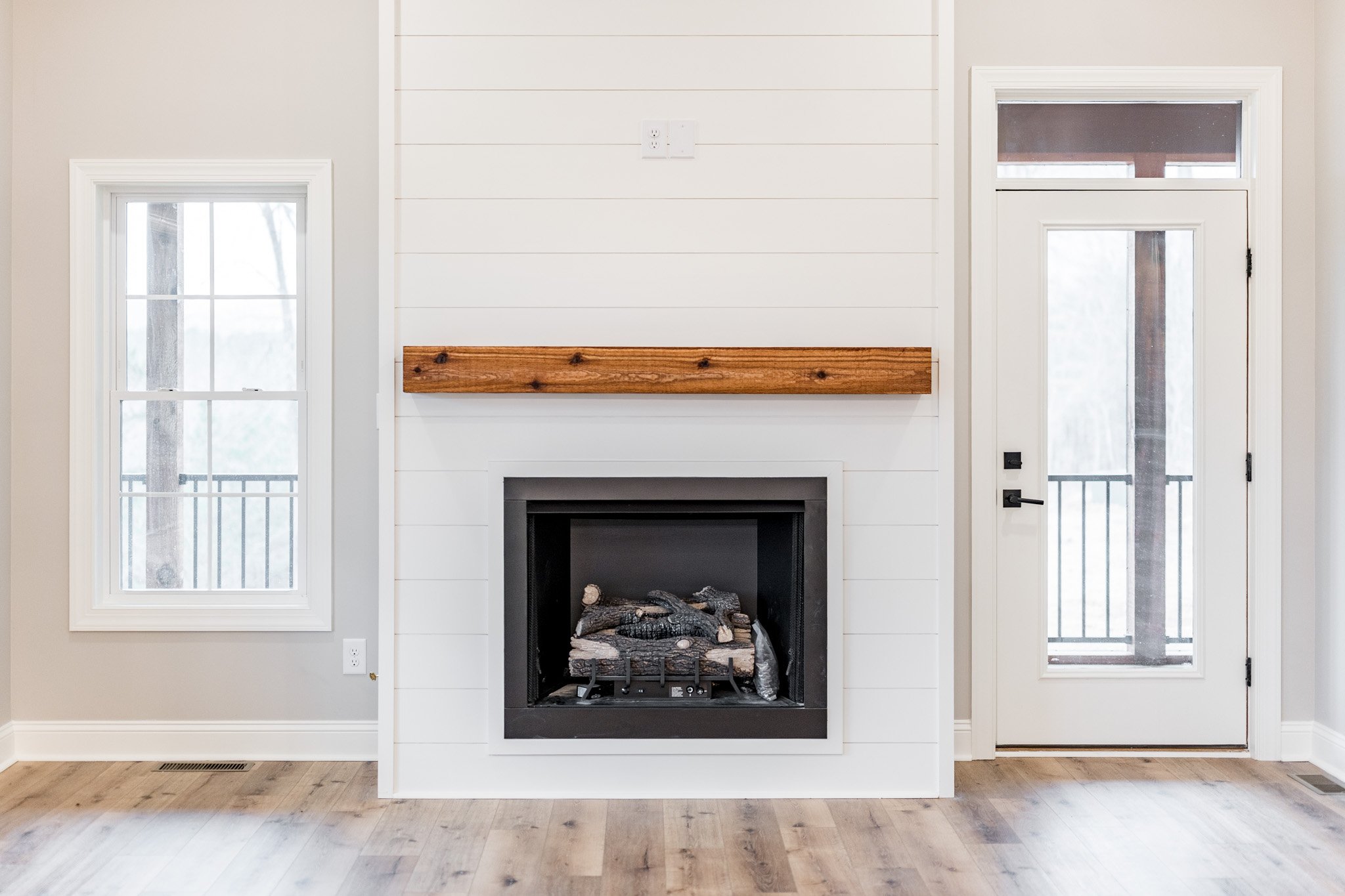 Inside, Foxfire pairs clean lines with rich natural textures to create a sophisticated yet relaxed interior. The vaulted living space is anchored by a fireplace feature wall, while the kitchen makes a strong statement with custom cabinetry, a beautifully finished island, stone countertops, artisan inspired tile, and carefully integrated storage details that reflect true craftsmanship. The primary suite continues the home’s elevated feel with a spa-like bath, freestanding soaking tub, tiled walk-in shower, and warm wood vanity finishes. Features like the sliding barn door and covered outdoor spaces add charm, function, and a distinct sense of mountain luxury throughout.