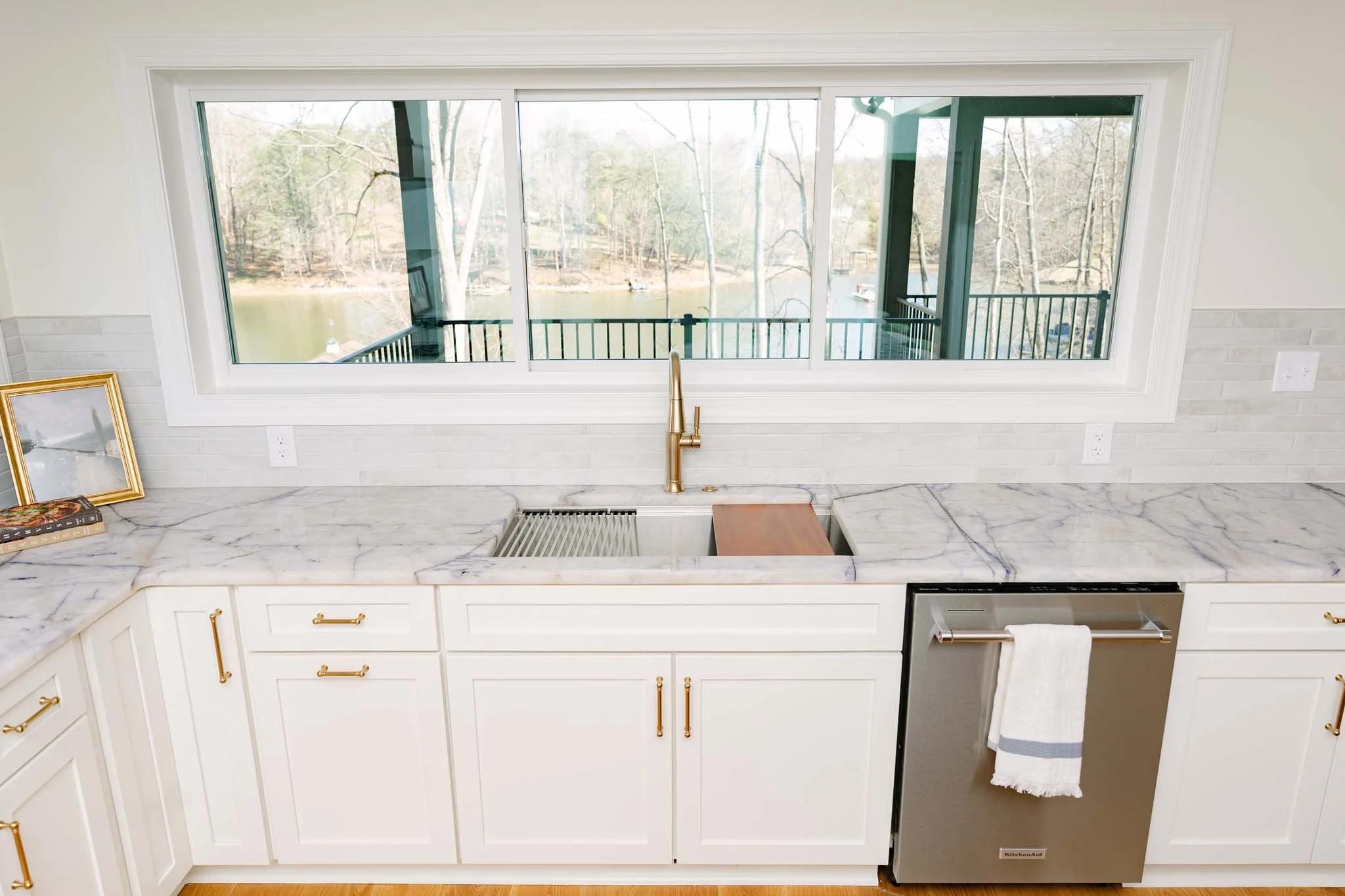 At the heart of the home, the kitchen is both a functional centerpiece and a visual highlight, designed to maximize its connection to the surrounding waterfront setting. Expansive windows frame serene water views, filling the space with natural light and creating an ever-changing backdrop that elevates everyday living.