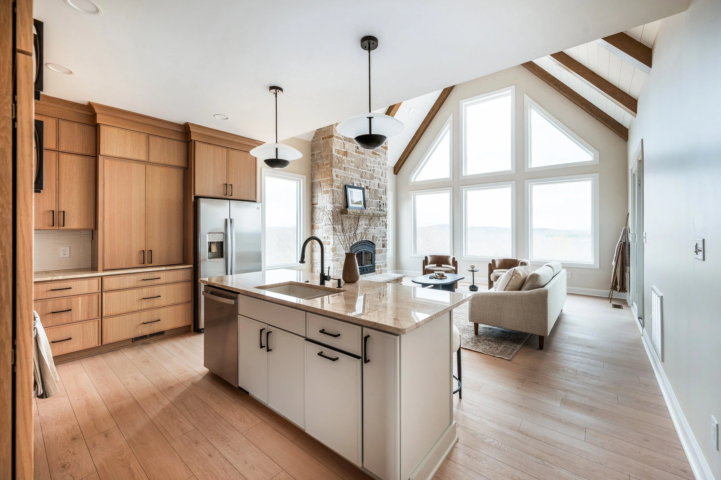 The great room at the heart of Stillpine is where design and function truly shine. We envisioned a space that would feel open, bright, and connected to the outdoors—and we brought that vision to life with a soaring vaulted ceiling and a dramatic wall of oversized windows. These windows were strategically placed to flood the room with natural light throughout the day and to frame the stunning mountain landscape like a living piece of art. Anchoring the room is a custom-designed, large-format stone fireplace that provides warmth and character, creating a gathering space that feels as inspiring as it is comfortable.
